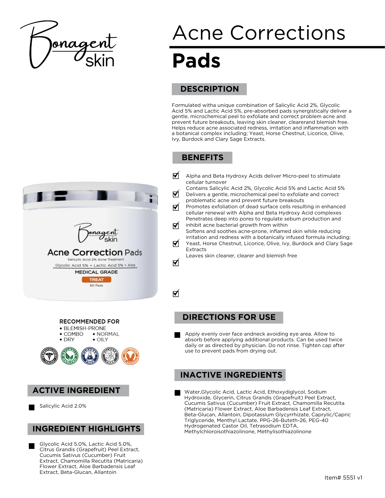 Formulated with a unique combination of Salicylic Acid 2%, Glycolic Acid 5% and Lactic Acid 5%, pre-absorbed pads synergistically deliver a gentle, microchemical peel to exfoliate and correct problem acne and prevent future breakouts, leaving skin cleaner, clearer and blemish free. Helps reduce acne associated redness, irritation and inflammation with a botanical complex including; Yeast, Horse Chestnut, Licorice, Olive, Ivy, Burdock and Clary Sage Extracts.