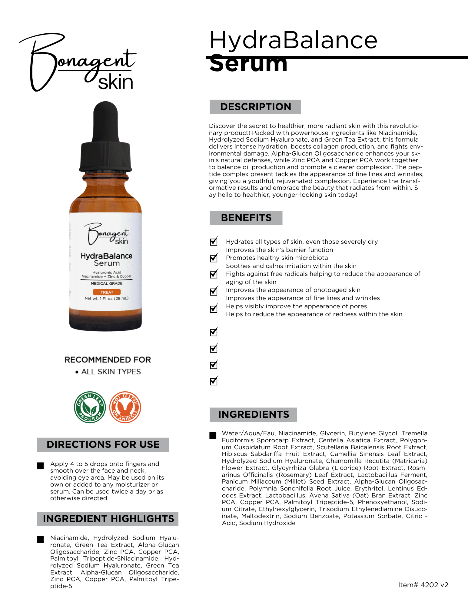 Discover the secret to healthier, more radiant skin with this revolutionary product! Packed with powerhouse ingredients like Niacinamide, Hydrolyzed Sodium Hyaluronate, and Green Tea Extract, this formula delivers intense hydration, boosts collagen production, and fights environmental damage. Alpha-Glucan Oligosaccharide enhances your skin’s natural defenses, while Zinc PCA and Copper PCA work together to balance oil production and promote a clearer complexion. The pep- tide complex present tackles the appearance of fine lines and wrinkles, giving you a youthful, rejuvenated complexion. Experience the transformative results and embrace the beauty that radiates from within. S- ay hello to healthier, younger-looking skin today!