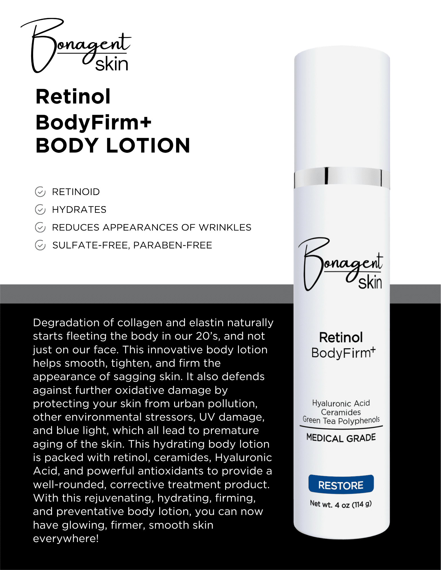 An innovative and hydrating body lotion employs the power of retinol, which helps diminish the appearance of uneven skin tone and renews the feeling of softer, firmer skin. At the same time, other actives actively protect against further oxidative stress and blue light damage that leads to premature skin aging.